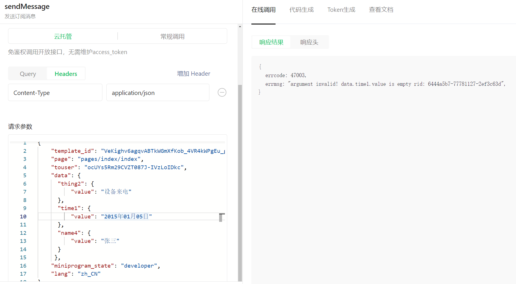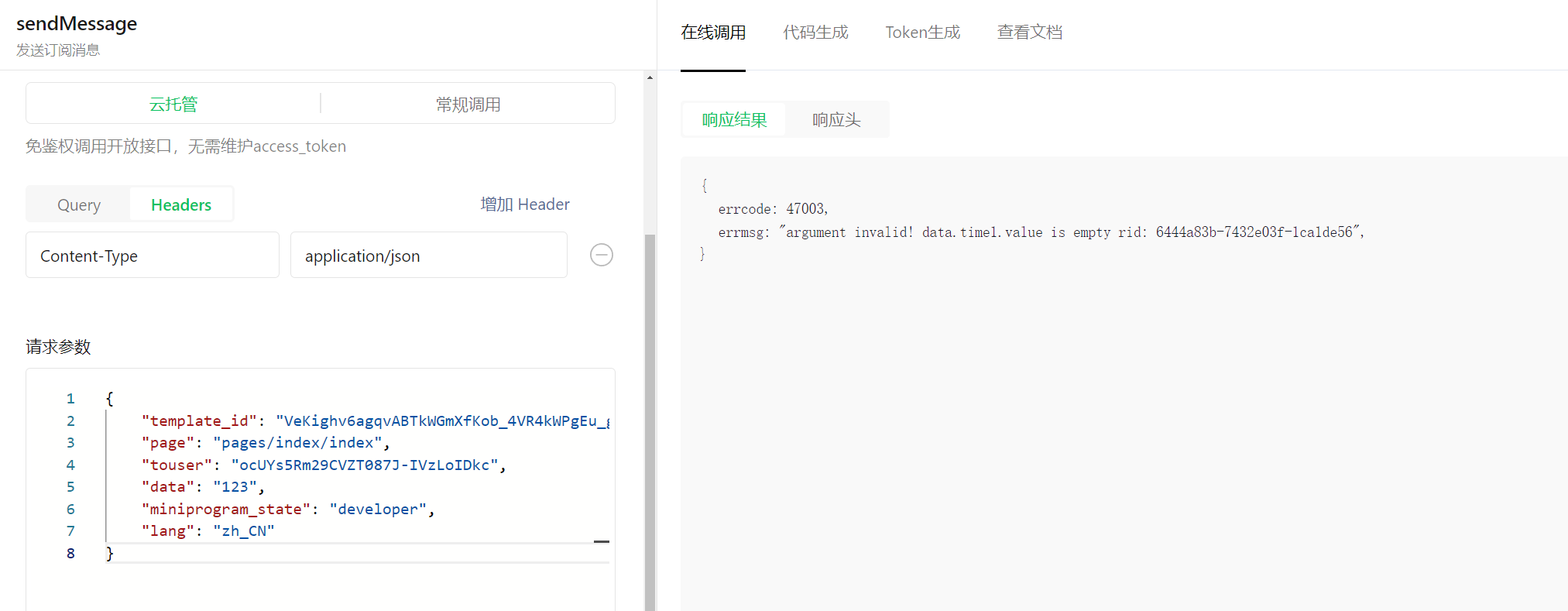 在调试工具里用的data参考例子为json形式,但文档里是string类型,实际用的json报错,换成string也报错,怎么解决?