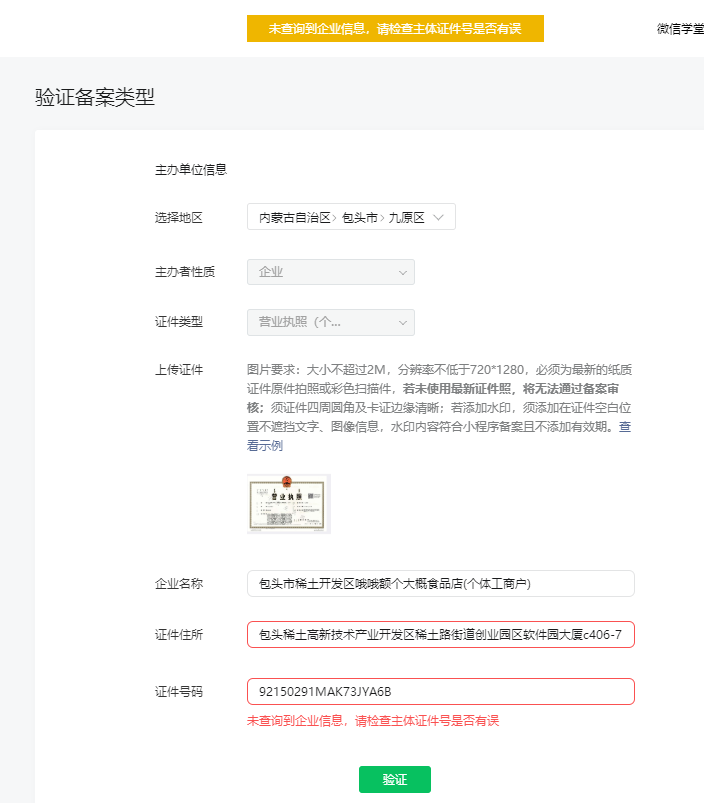 小程序备案时,显示“未查询到企业信息,请检查主体证件号是否有误” 如何处理?