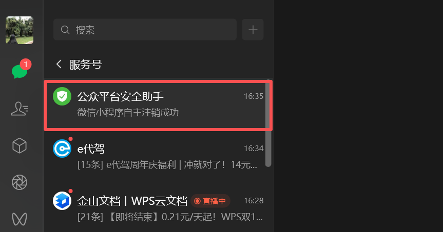 或者是在微信聊天列表里找“服务号”,里面是各种服务的通知、信息,“公众平台安全助手”的通知也会出现在这里。