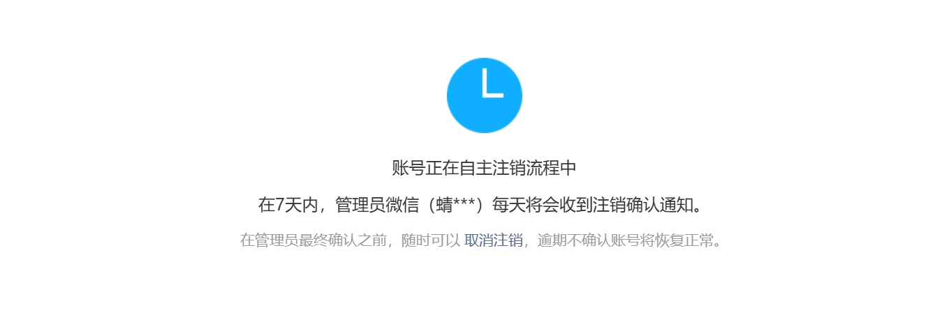 1、今天已经是过了7天,但是管理员仍然没有收到任何注销的消息。帮忙看看这类通知会以什么形式(服务通知?、短信?)通知到管理员?