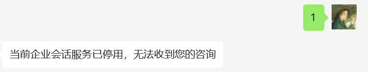 如图,在公众号中发送任何内容均回复“当前企业会话服务已停用,无法收到您的咨询”,公众号设置的快捷词也不生效了