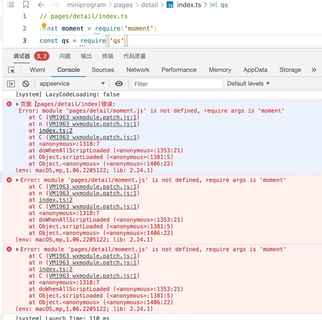 开发的过程中用到了moment和qs两个模块,但是在引入之后,报这样的错误