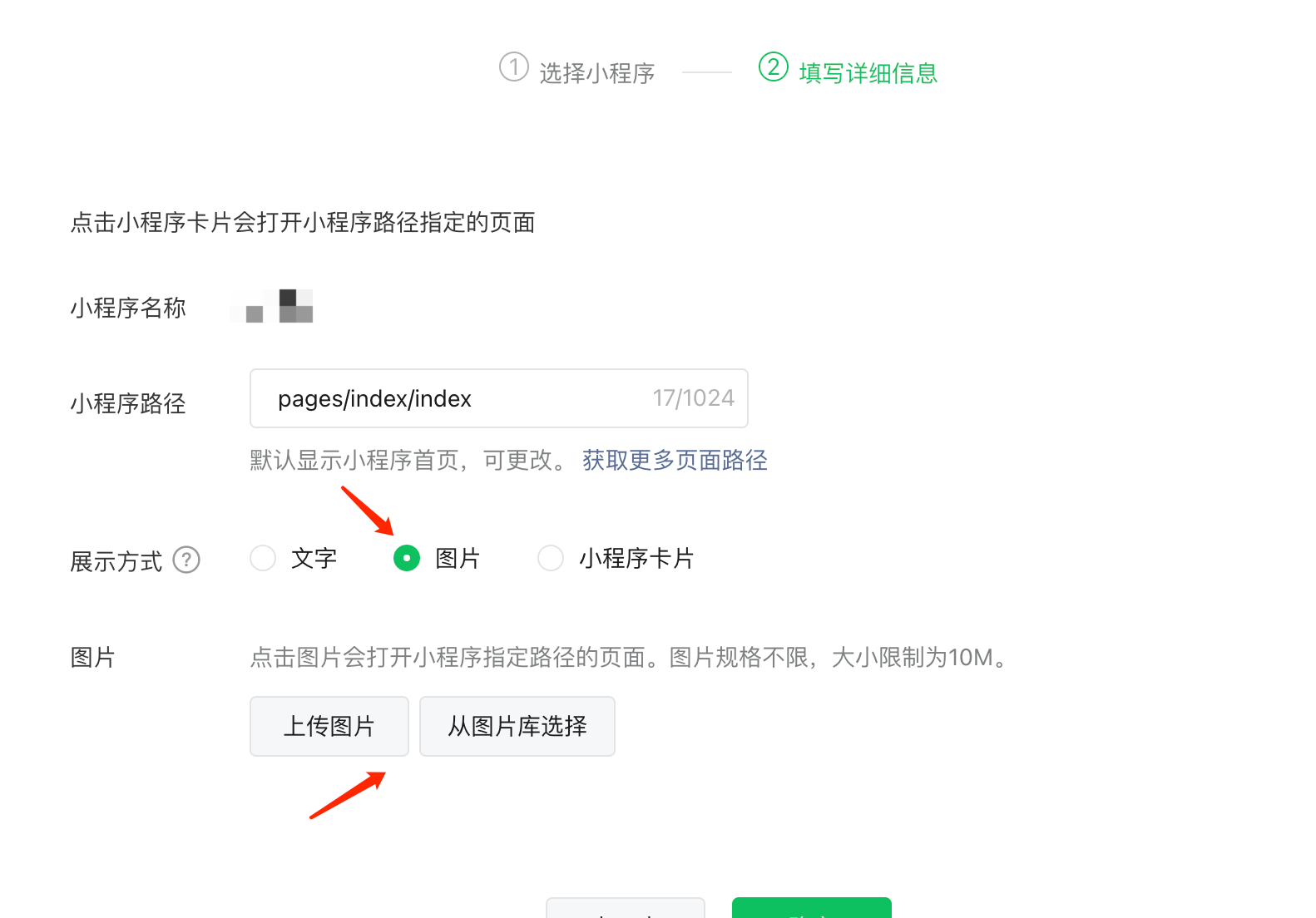 编辑图文时顶部点击小程序,选择跳转的小程序后弹出编辑页面,