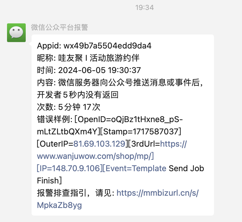 同一个封装接口一天公众号通知发送很多,但每天会提醒一次(就一次)报警群,后台日志查看发送的通知ok了,公众号触发事件监听也执行响应了。