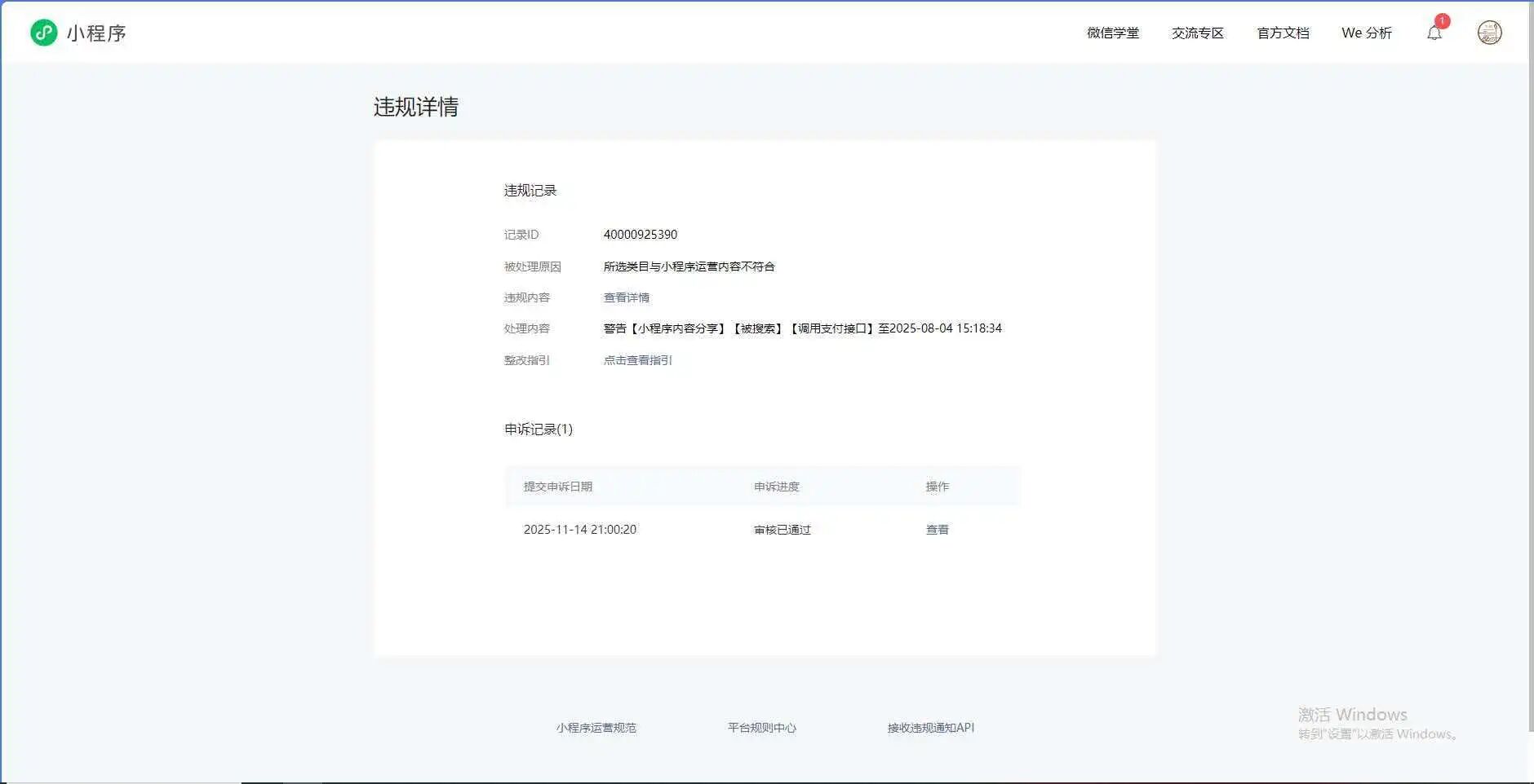 不懂操作,已经错误的申诉过两次,现在已经正确的修改完善了。但是没有申诉入口,请求再次审批相关问题,放行被限制【小程序内容分享】;【被搜索】;【调用支付接口】。