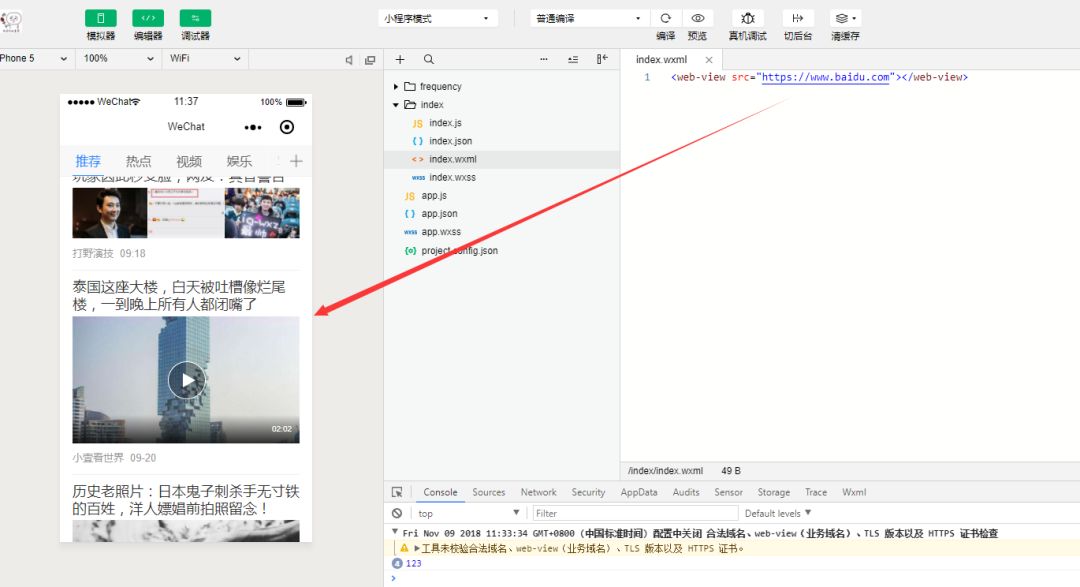 测试环境,已开启不检验合法域名,web-view应当显示网页,并且触发相应事件。