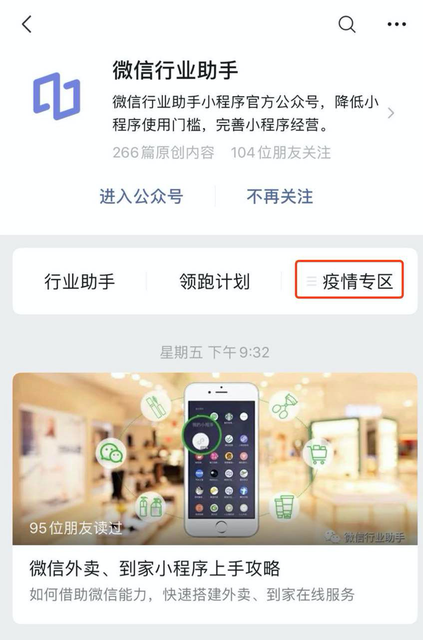 但本次疫情专区报名是开放的,只要在【医疗服务】、【快递同城】、【到家自提】、【电商服务】这四类业务范围内的开发者,都直接在公众号菜单栏直接点击报名,无须依赖于行业助手小程序的行业审核流程。