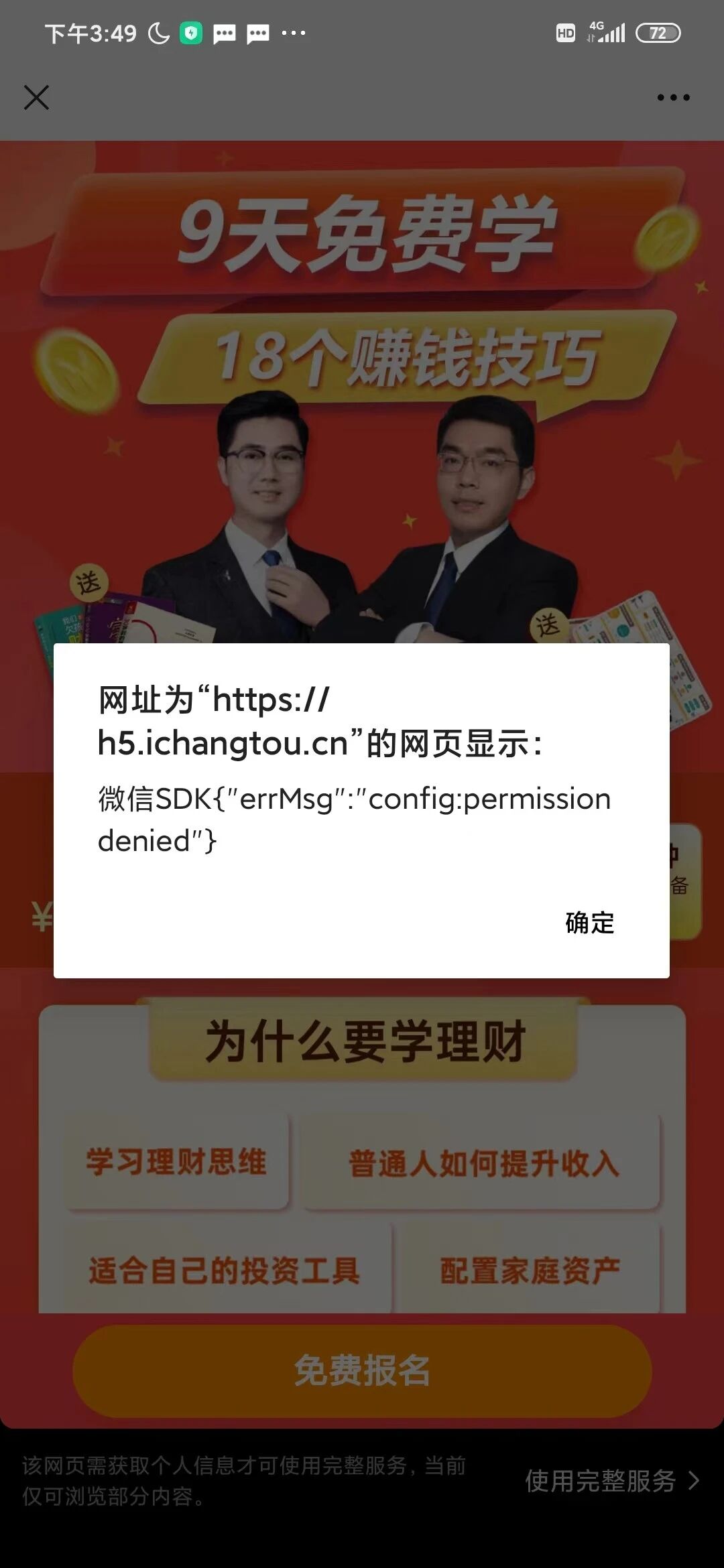微信jssdk调用wx.config,报错config:permission denied,config是什么权限,一般什么情况会出现这个提示?