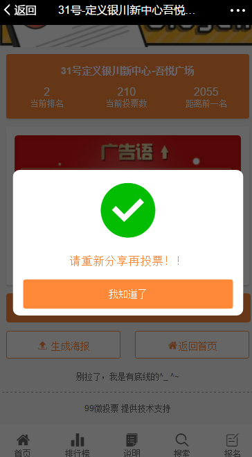 我是在参与一个投票活动,我的专属网址发给别人投票都会打不开,而投票又必须在微信端才可以,同样的主域名别人就没事,这样就造成很不公平,别人想给我投票没办法投。https://hudong.99wtp.cn/details/89693/0.011102124699573945 这个是我的专属域名,怎么样能解封?
