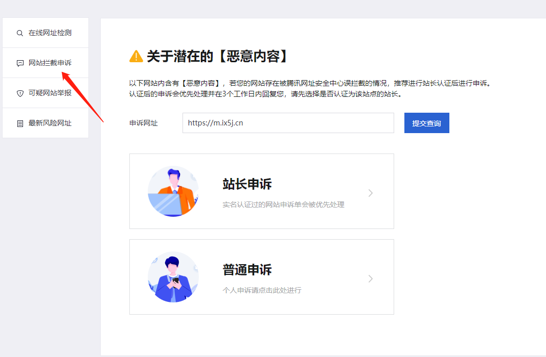你好,经核实域名https://m.ix5j.cn被手机管家拦截,此处仅处理被微信暂停提供微信内直接访问的服务的外部链接的申诉问题,此服务不在受理范围,请登录手机管家官网【http://gj.qq.com/online_server/complain_url.html】自行申诉,知悉。