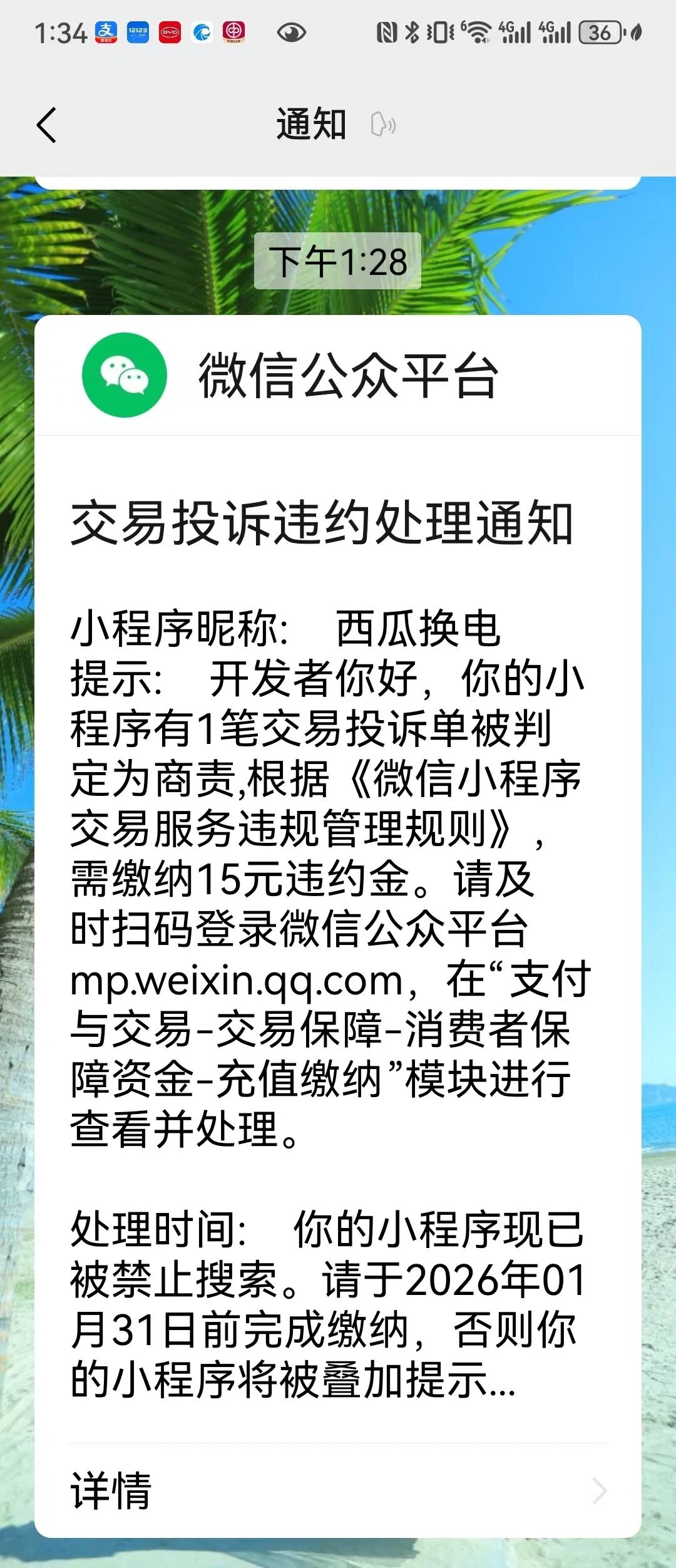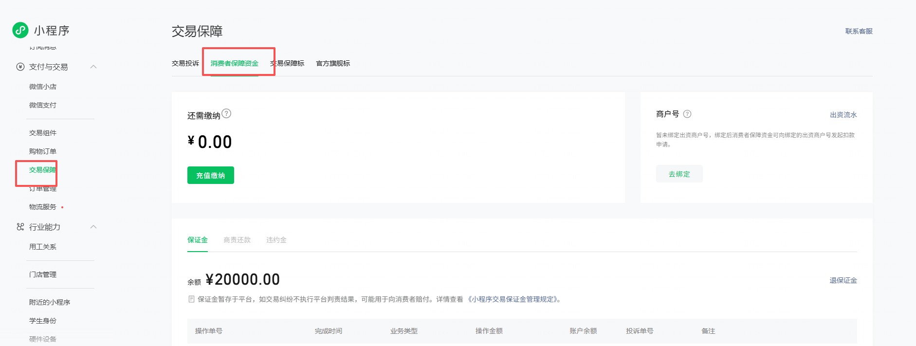 违约金缴纳路径:https://mp.weixin.qq.com/ 支付与交易-交易保障-消费者保障资金 点击缴纳充值。