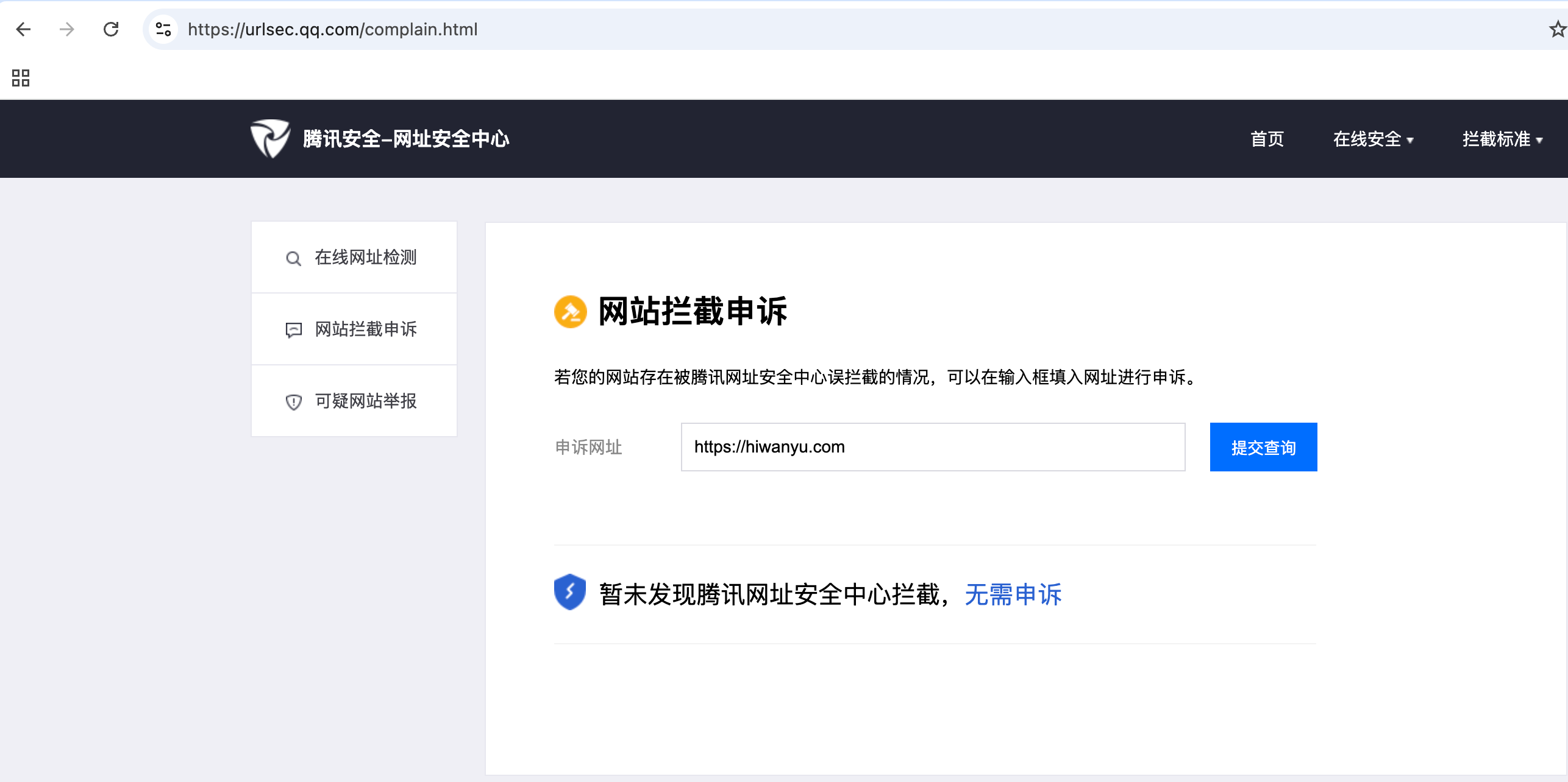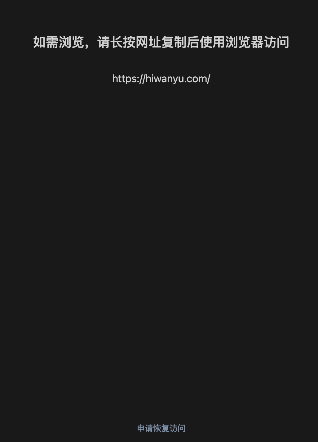 https://hiwanyu.com/,域名并未违规,但是在微信内无法直接访问,需要能恢复直接访问