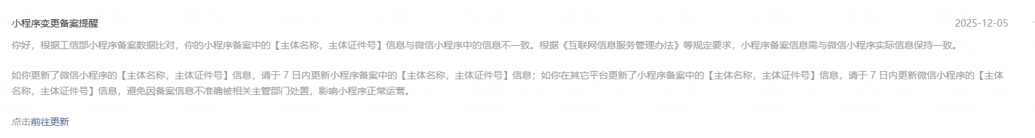 因主体变更需注销备案的,当前暂不影响小程序使用,注销后请尽快使用新主体重新发起备案,后续请开发者持续关注平台的公告、通知、站内信及模板消息等渠道。