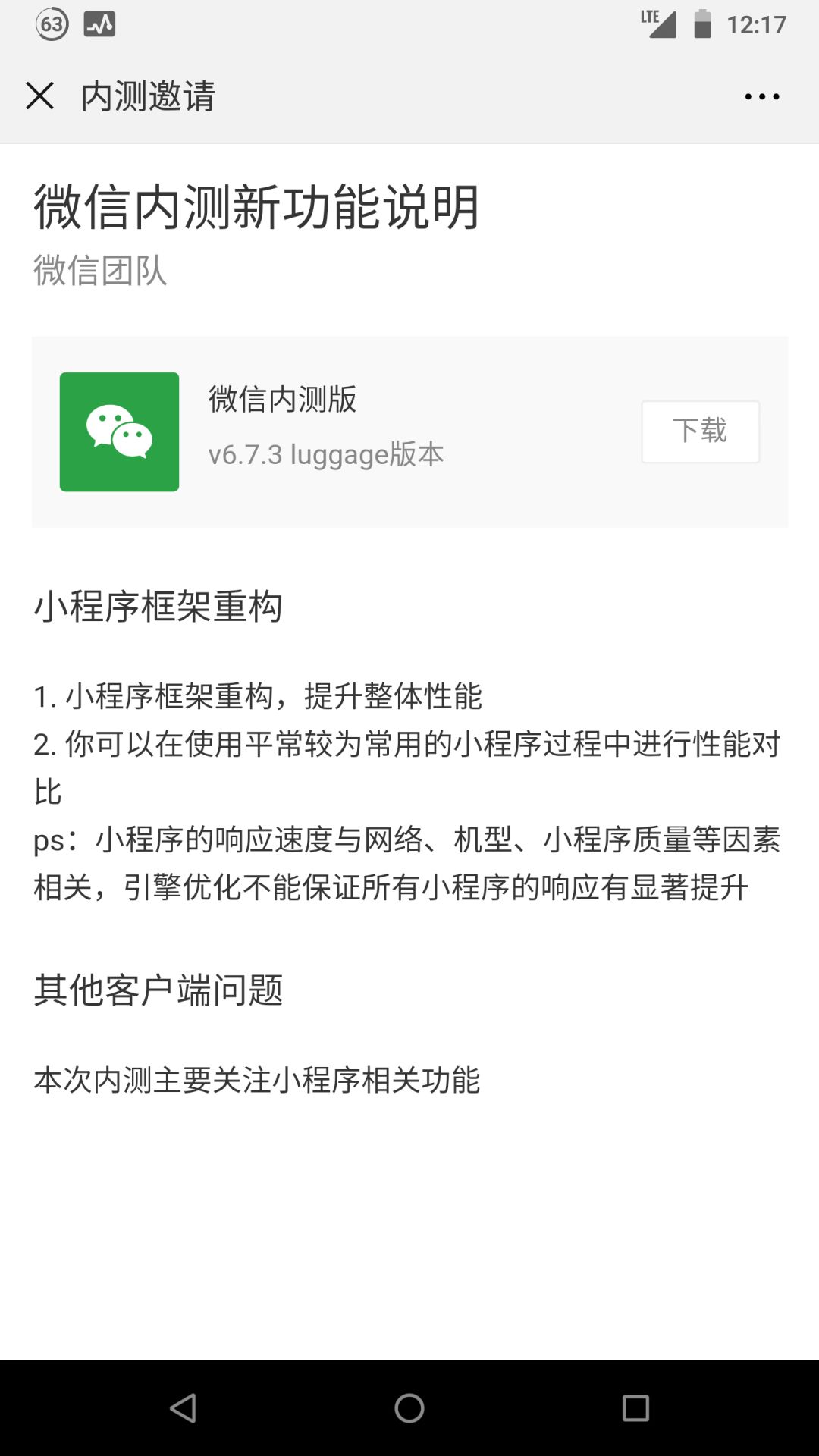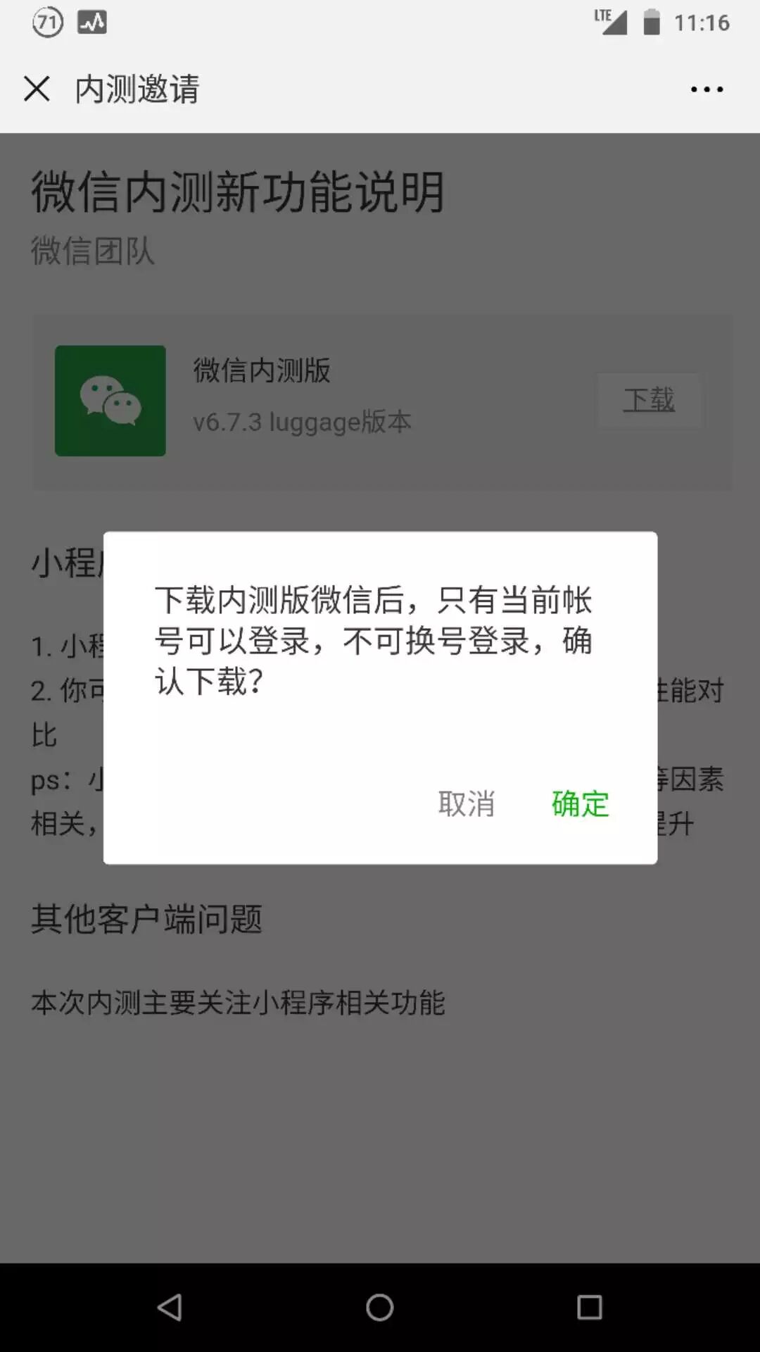 周末在家,收到了微信团队推送的内部测试版下载邀请,但点击下载提示框的确定按钮,什么反应也没有,能否私信给个单独的 APK 下载链接啊?