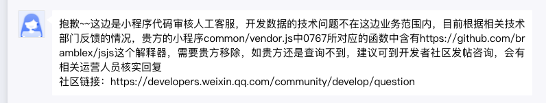 麻烦官方告诉我们该怎么去解决这个问题,我能确定我们没有这个引入这个库,第三方库中就只有lottie-miniapp这个动画库和crypto-js这个加解密的库,我们愿意把项目源代码交过去给你们官方的人员来打包,看看是怎么搞出来这个jsjs的解析器