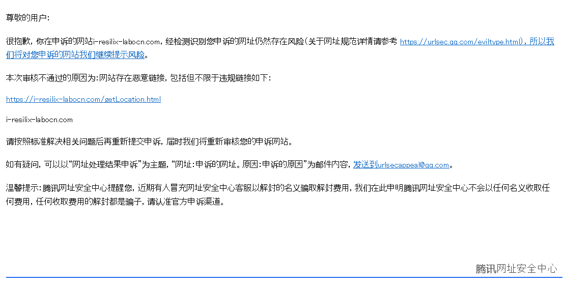 然后去在网上查了去【https://urlsec.qq.com/complain.html】申诉,说【https://i-resilix-labocn.com/getLocation.html】是恶意链接