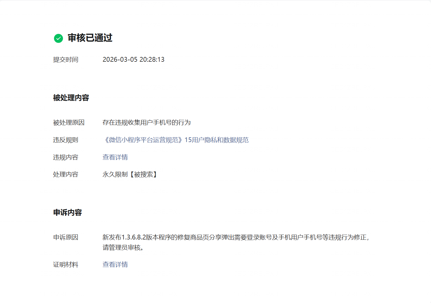 小程序的appid:wx864379e3d51b6fb4;原始ID :gh_556a9f0f90a1;小程序出现违规收集用户手机号情况,我司已通过修改指引文档,修改程序代码,发布新的版本,并完成了官方代码审核,希望管理员可以帮我们小程序解封账号登录功能,非常感谢!