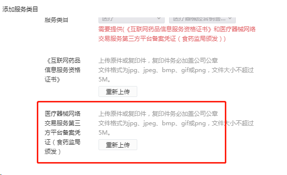 1)涉小程序“医疗-医疗器械经营销售平台”类目需提供:《互联网药品信息服务资格证书》和医疗器械网络交易服务第三方平台备案凭证(食药监局颁发);