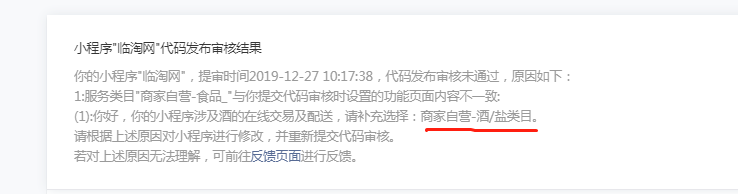 你好,经核实,你的小程序2019-12-27,10:17提审版本确实未补充商家自营-酒/盐类目,查看到该类目于2019-12-27 10:57审核通过,最新提审版本已有相关类目,请耐心等待工作人员审核