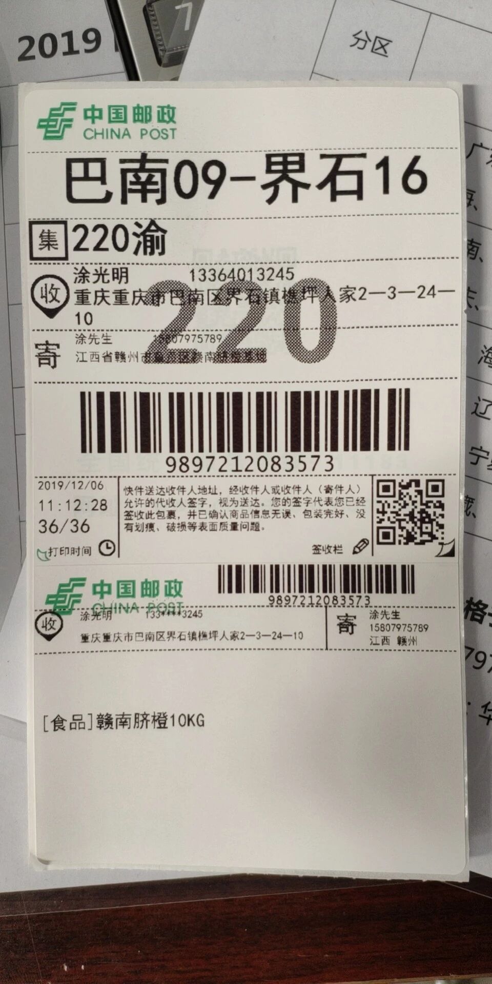 在此,我不得不提出微信的物流助手的面单存在的一个缺陷,那就是面单上没有分拣号(如我上传图片中的220),就是图中较大的数字,这个在快递分拣时十分重要,希望官方能完善一下,谢谢!