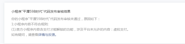 拜托给我个理由,之前发帖,回复我说我的小程序不涉及虚拟支付,是别的原因,我好不容易改正了,又给我打回说是虚拟支付?这样循环到什么时候?