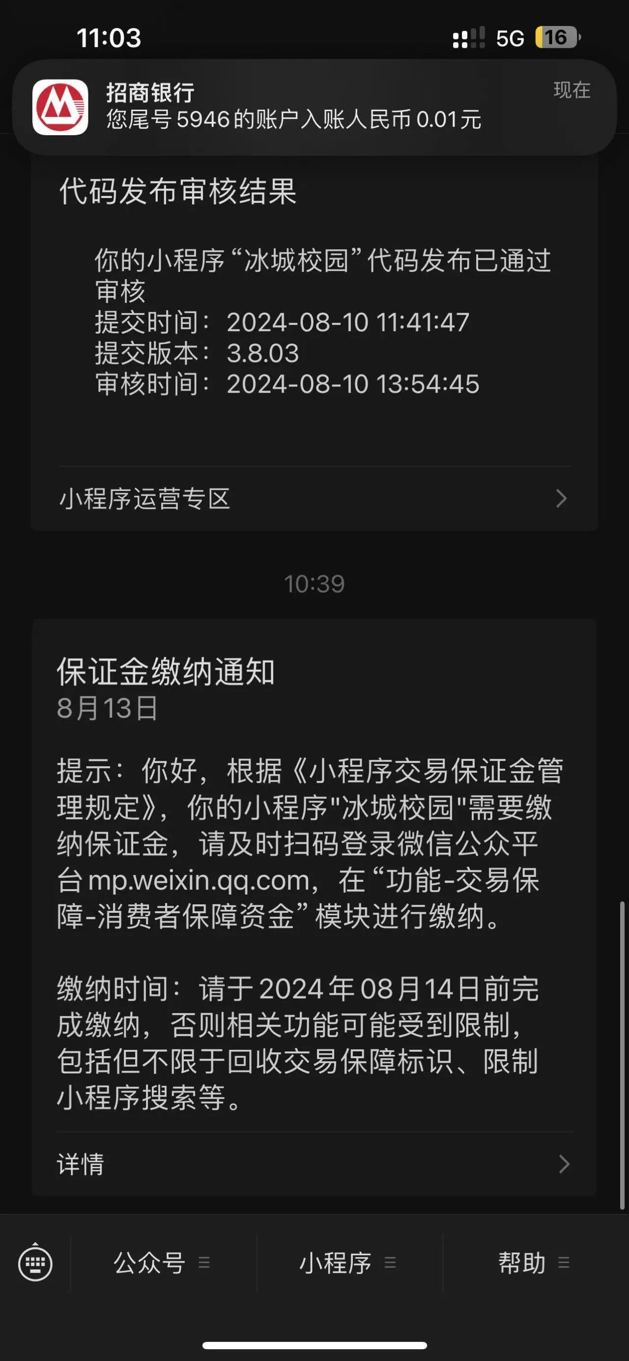 关注后,可在微信内接收相应的重要提醒。