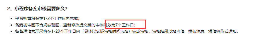 这个是7个工作日,不包含周六、周日的,一般资料没问题,不需要这么久,主体负责人注意接听电话,免得未接听电话造成备案订单被驳回。