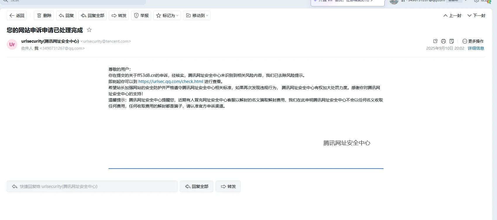 也使用了「腾讯安全-网址安全中心[6]」对网站域名进行检测,显示的是域名安全,但是就是显示需要继续访问,这个大大影响了我,麻烦审核大人解封一下,恢复一下微信内可直接访问该域名服务谢谢。