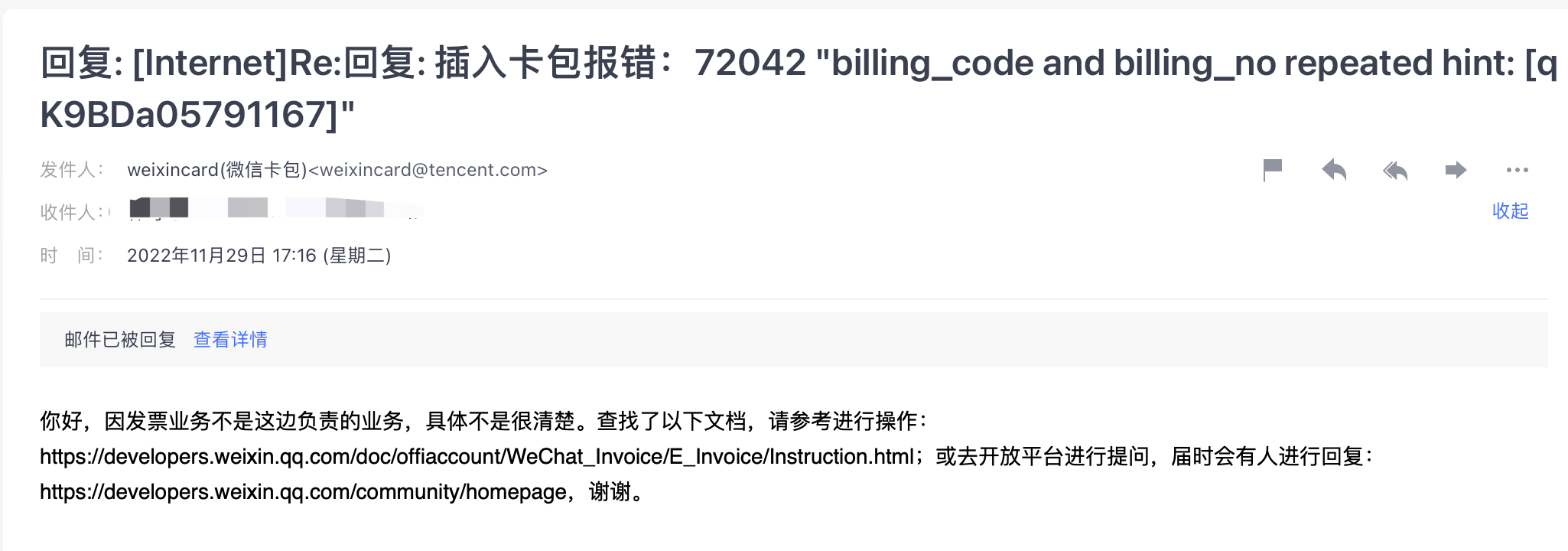 将电子发票卡券插入用户卡包请求返回错误码72042 错误信息illing_code and billing_no repeated 发票号码和发票代码重复