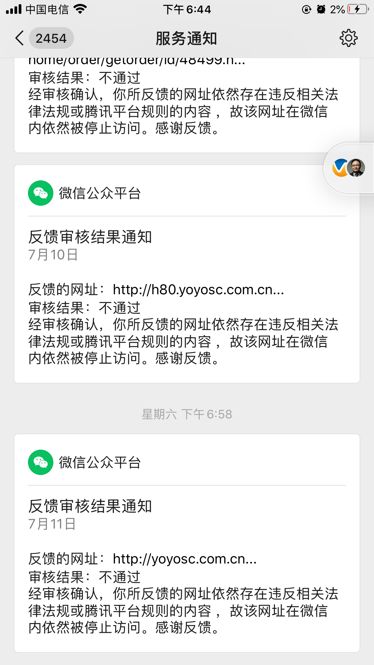 你好,域名提示被微信拦截,我们已经反复确认,并删除了可能不合规的内容,我查看服务器提示有问题的链接页面都给删除了。现在找不出来其他有违反法律的页面。 如果微信官方还检测到,能否详细说明一下哪个页面,提交了4次都是很抽象的回答,这样解决不了根本问题。 另外我付上截图,麻烦技术帮忙跟进一下。网站的地址截图上也有。