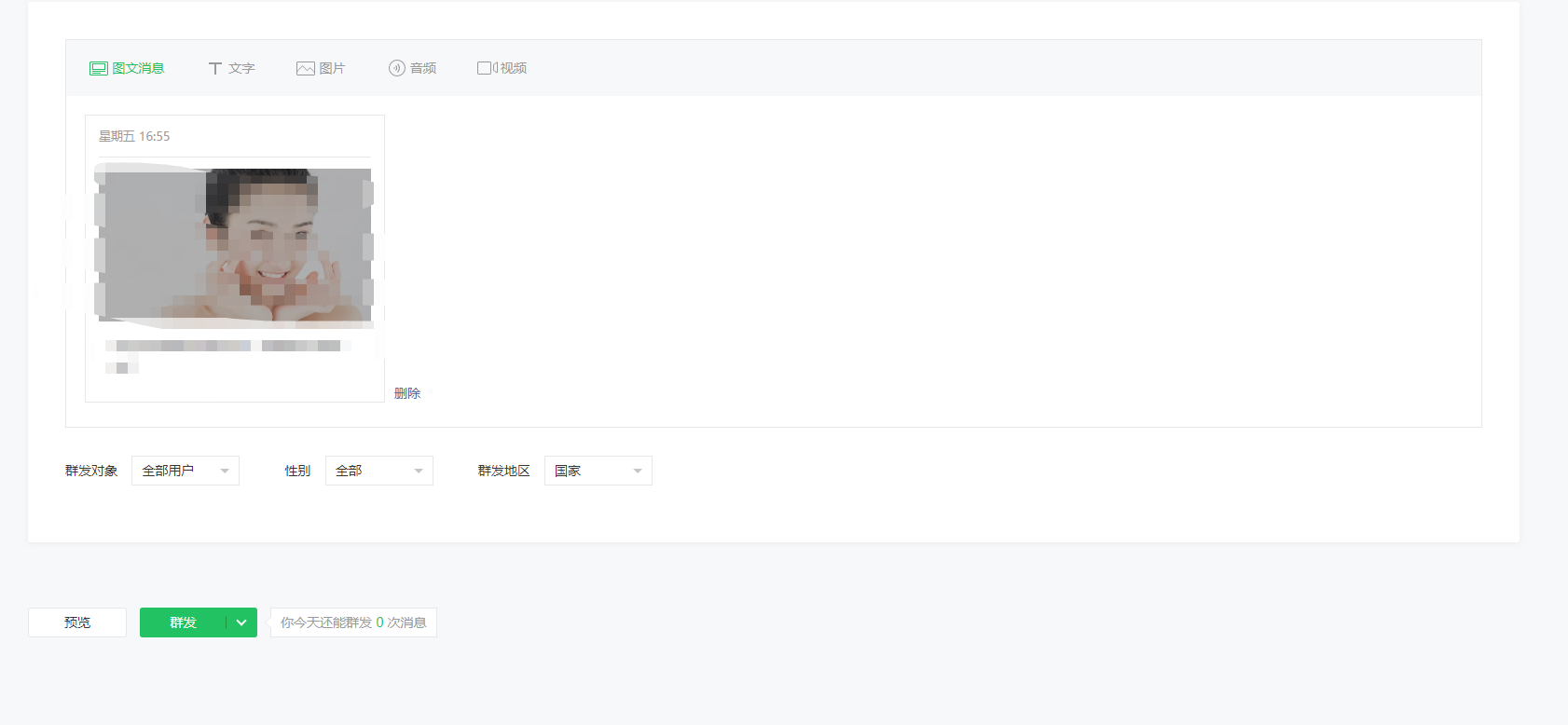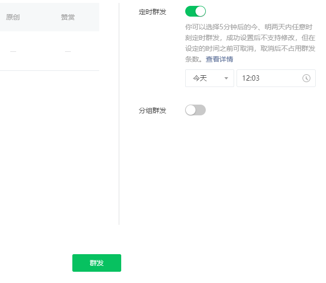 新版后台可以直接在编辑器完成群发操作,开启定时群发,设置好定时后。点击群发即可
