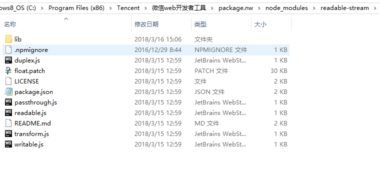 弄错了,但是C:\Program Files (x86)\Tencent\微信web开发者工具\package.nw\node_modules\readdirp\node_modules\readable-stream里面没有node_modules目录