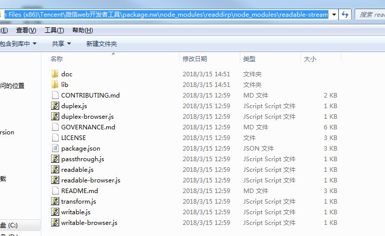 是C:\Program Files (x86)\Tencent\微信web开发者工具\package.nw\node_modules\readdirp\node_modules\readable-stream下面的node_modules