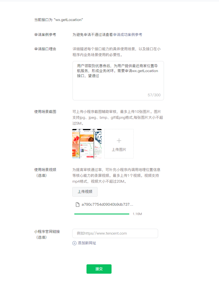 小程序wx.getLocation接口审核一直不通过,已经提交多次,截图,视频,导航都上传了,服务类目也更新过了,可就是无法通过。驳回理由都是“你提供的申请原因/辅助图片/网页/视频内容无法确认申请接口使用场景”,从驳回理由中无法看出是需要什么。