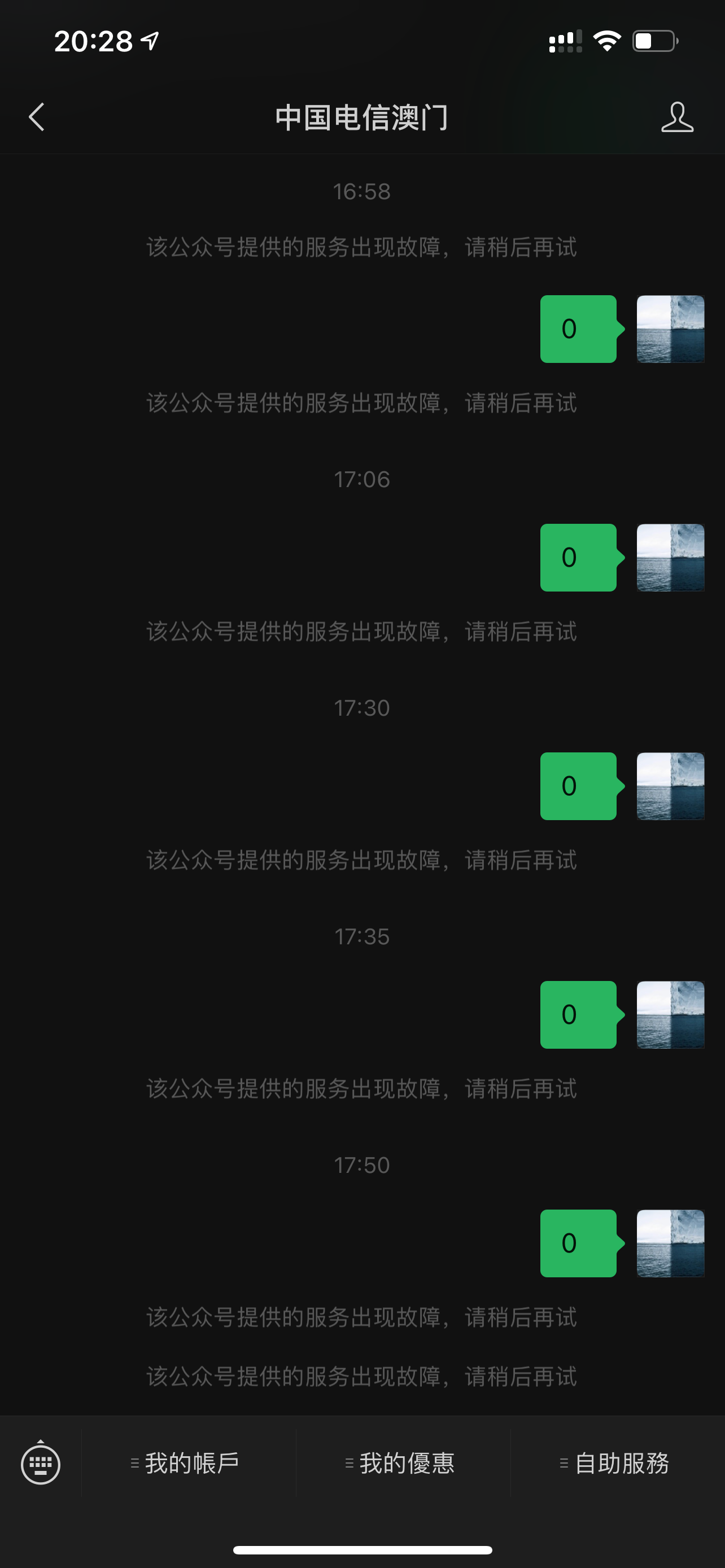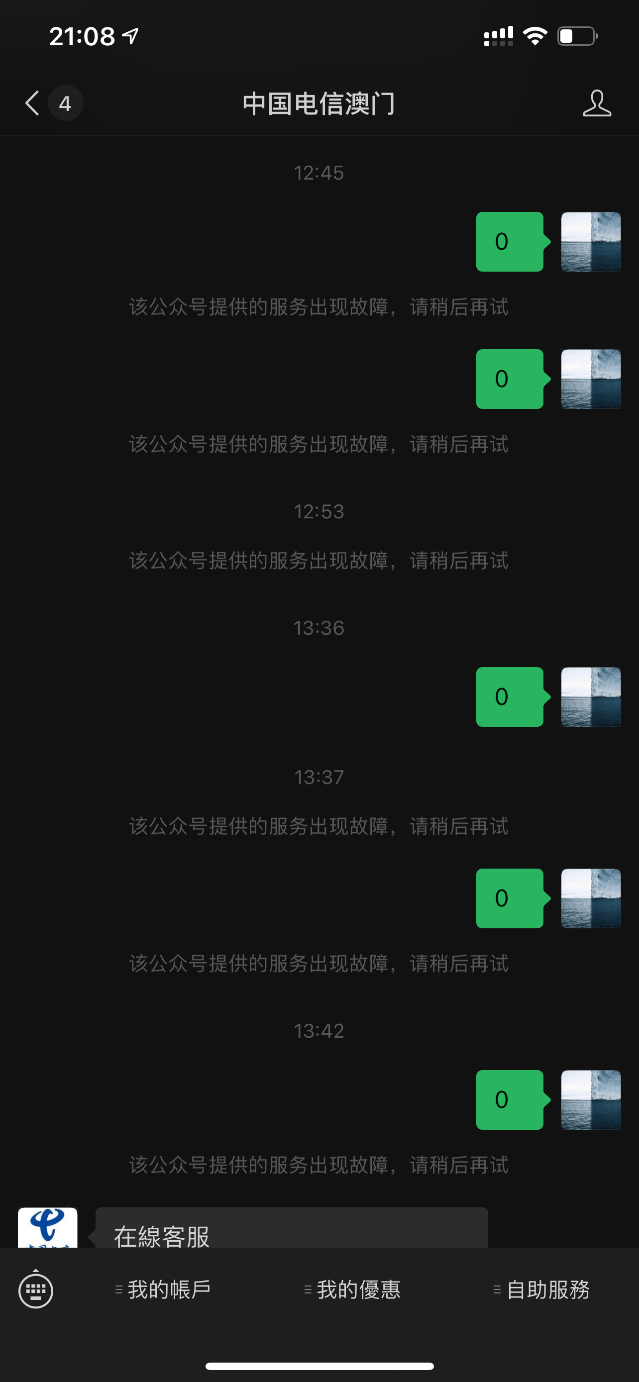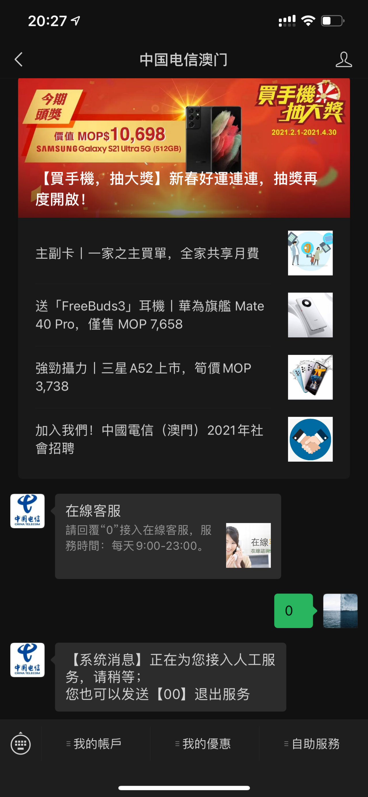 正常情况下(如图一)菜单“我的账户”-“最新优惠”上办部分的图文信息,“自助服务”-“在线客服”对应第二条的消息。
