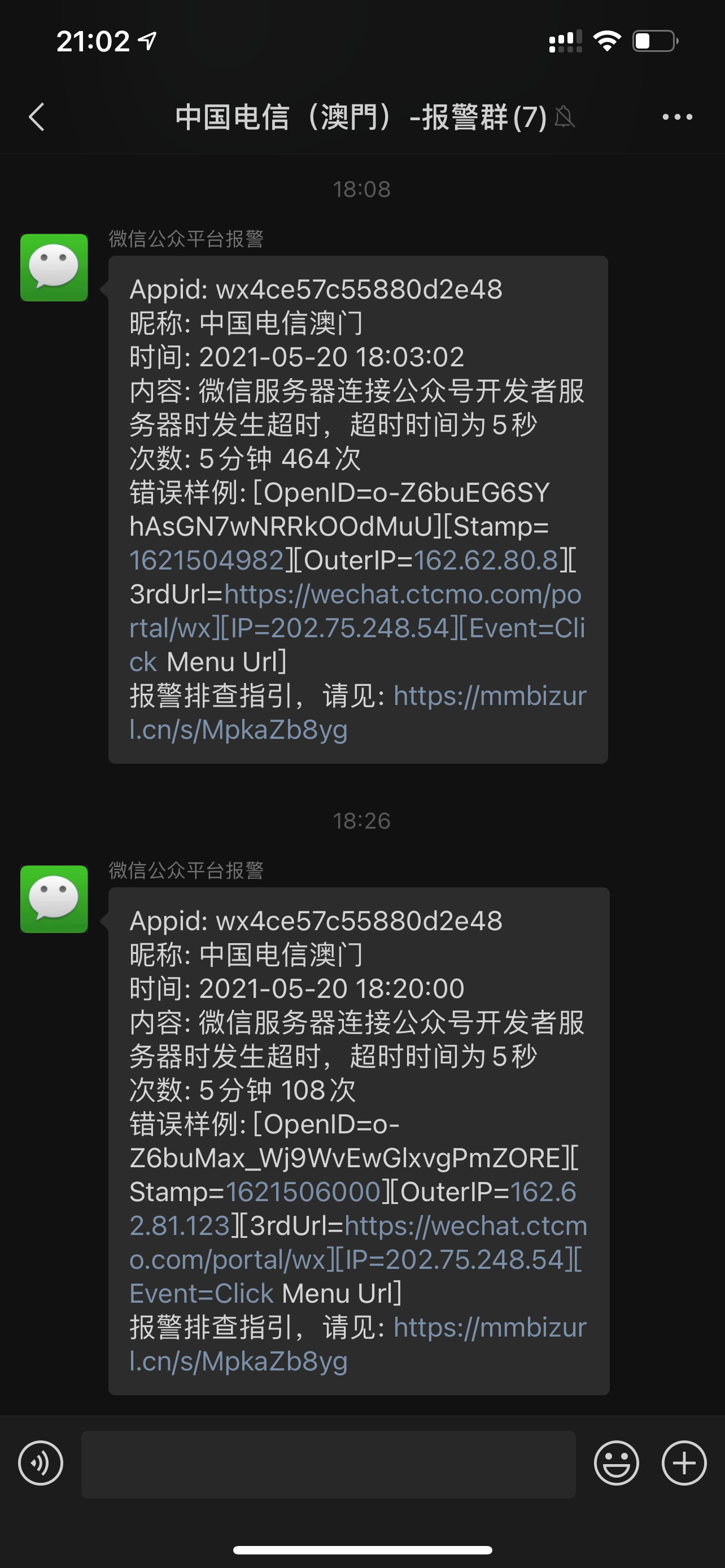 微信公众号服务报警群的信息中(如图四),outerIP 162.62网段是从俄罗斯莫斯科的腾讯云服务器过来的,不知道这是不是问题的关键,从澳门本地访问澳门本地的服务,结果要绕一圈到俄罗斯再绕回来,在这途中请求超时了。(connect to api.weixin.qq.com timed out)