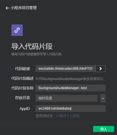 <a href='https://developers.weixin.qq.com/s/c09EAfmP755Y'>BackgroundAudioManager播放背景音频的代码片段</a>。