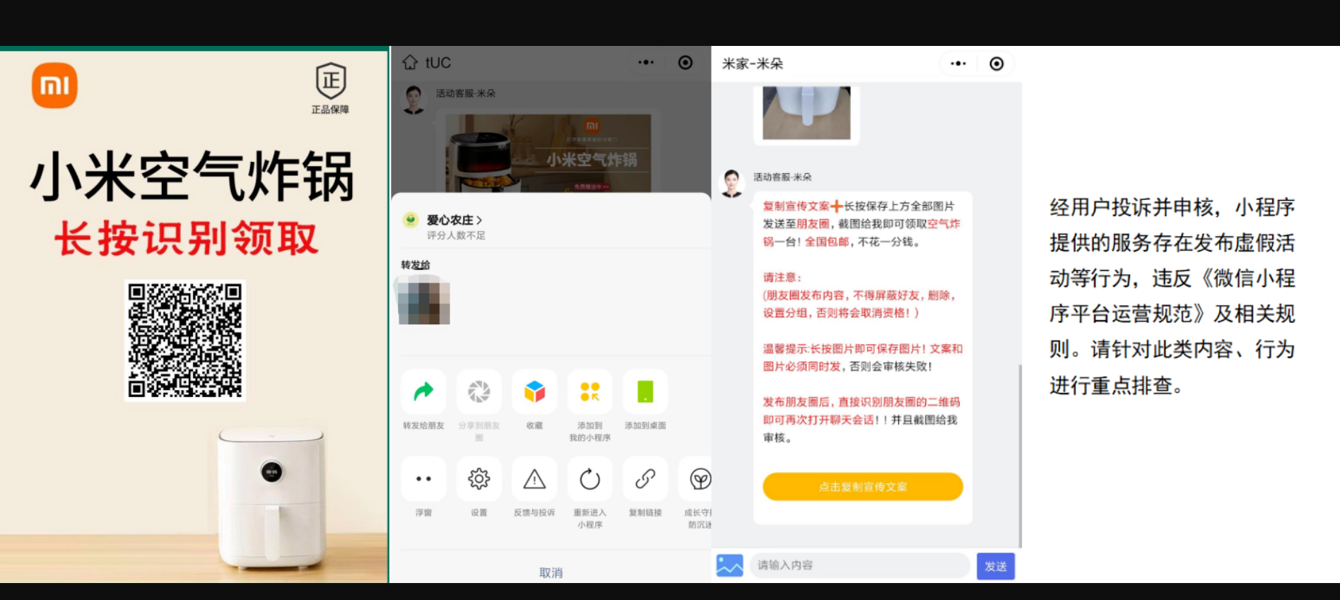 违规案例:单页面小程序,引导至客服消息咨询,客服引导用户保存带二维码的图片,并完成群发好友的操作,截图给客服,提示48小时后发货,涉嫌诱导用户分享,含欺骗用户成分。