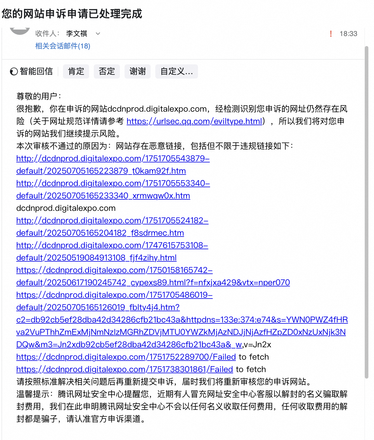 我们公司所有 *.digitalexpo.com的网站在微信内打开时,都提示“如需浏览,请长按网址复制后使用浏览器访问”。早在2025年10月第一次被微信拦截,就已经排查解决了存在的问题,申诉解封后,12月又被限制打开,每次申诉都反馈:经核实,腾讯网址安全中心未识别到相关风险内容,我们已去除风险提示。