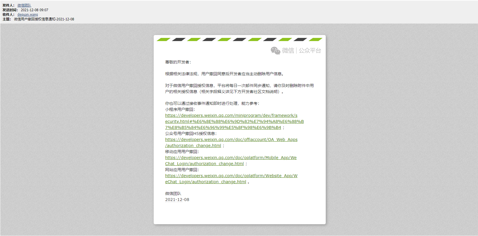 对于微信用户撤回授权信息,平台将每日一次邮件同步通知,请你及时删除附件中用户的相关授权信息(相关字段释义详见下方开发者社区文档说明)。