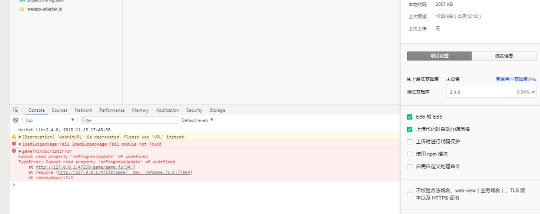 更新了最新的开发者工具以后,打开小游戏提示无法找到loadSubpackage接口。删除掉本地系统下面的所有文件以后重新登陆恢复正常,但是再次重新打开开发者工具以后又从新报错。在第一次打开可以进入游戏的时候直接弹出了一个视频广告。