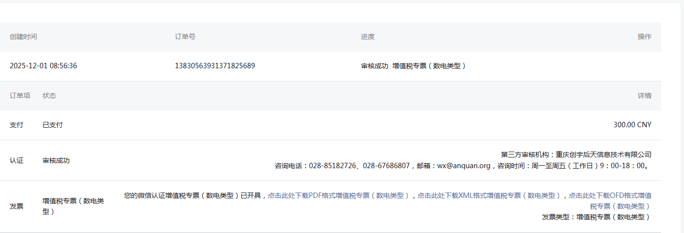 这张是我在公众号内操作支付完认证费用开具发票的截图。