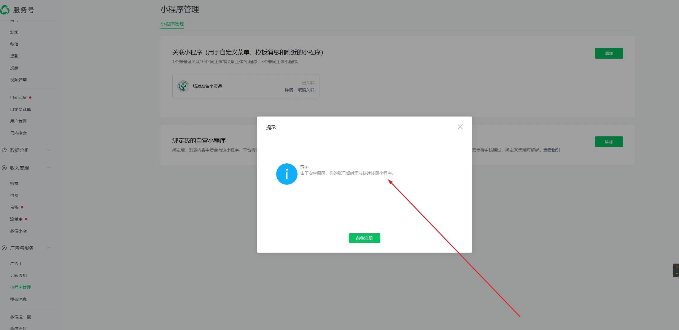 你好,我们是成都市青白江区人民医院(公立三甲医院),我们想用我们的服务号进行快速注册并认证小程序,系统提示:由于安全原因,你的账号暂时无法快速注册小程序。