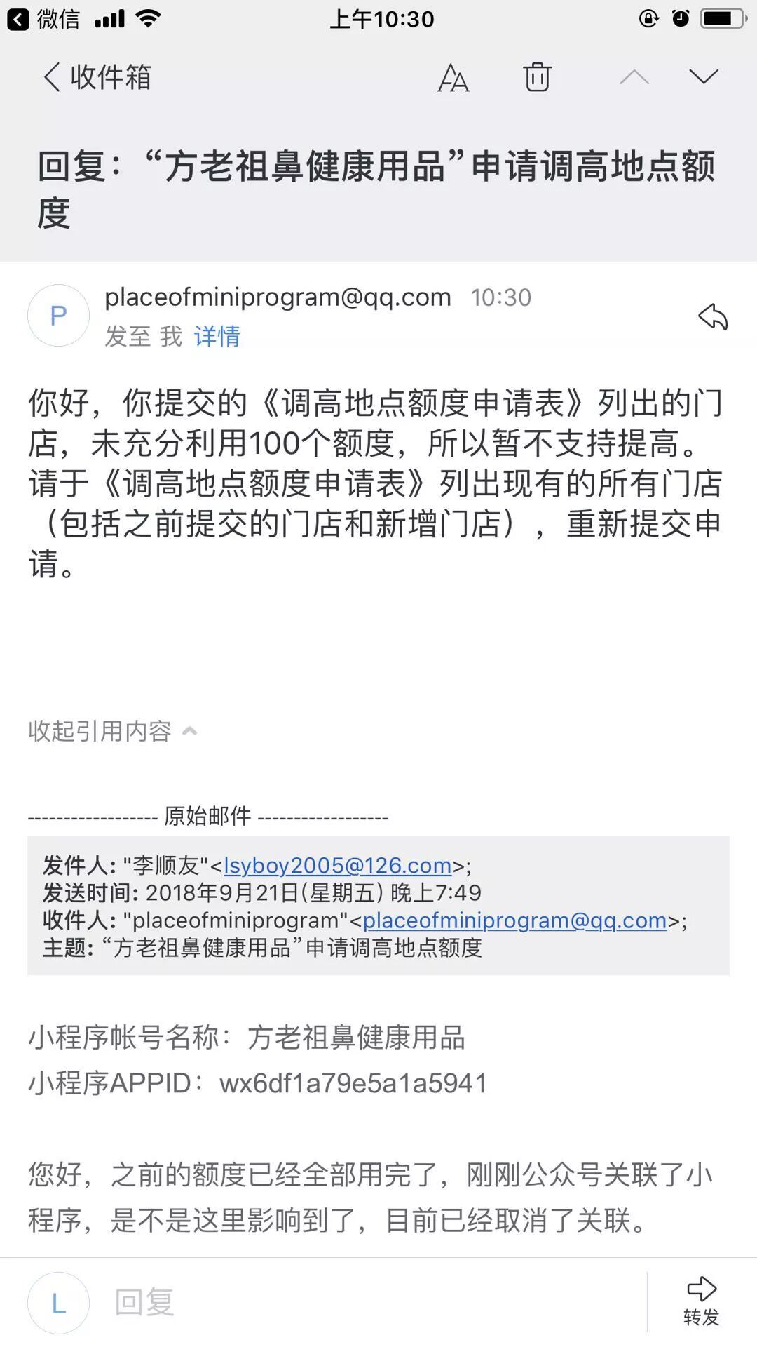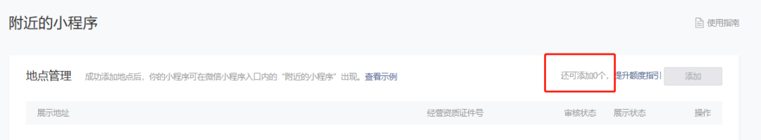 你好,如公众号或者小程序添加地点已达到上限需要提高额度,填写《调高地点额度申请表》的时候需要列出现有的所有门店(包括已经提交过的门店和新增商户),提交申请。我们将参考《调高地点额度申请表》中贵司提供的门店,在审核通过后为你调高额度。
