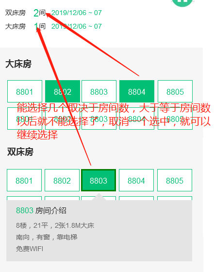 根据对应房型下的房间数量可以选中几间房,当选中的数量大于等于房间数量时,其他就不能选择了,点击一个已选中的房间以后,就可以继续选择