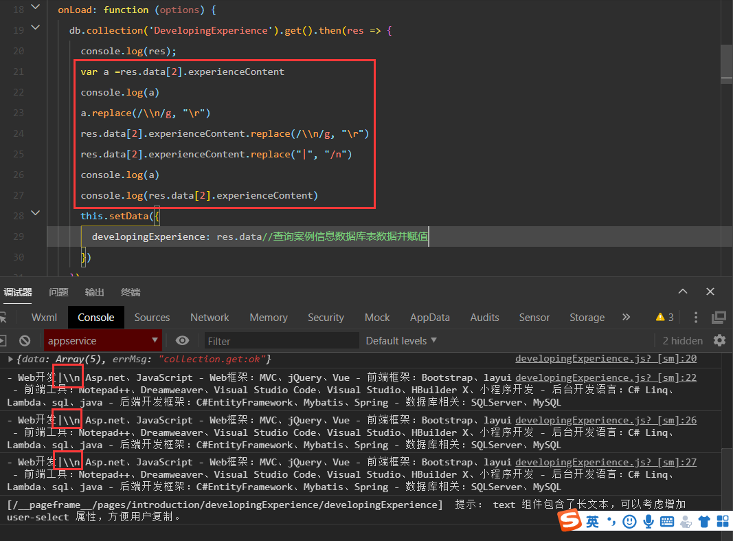 为什么小程序从云数据库存查一串字符串,然后使用replace替换字符会无效?代码和数据如图,求解