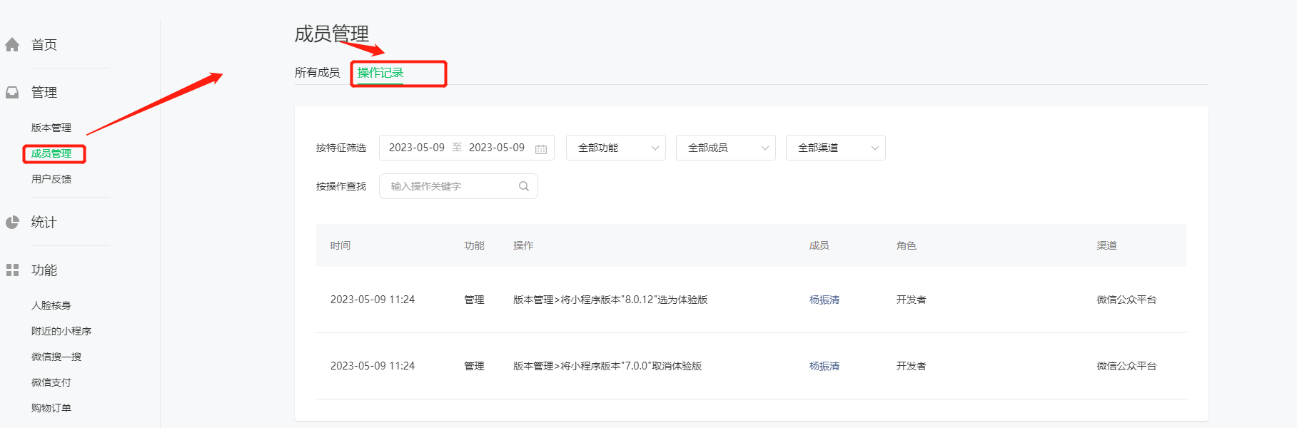 https://mp.weixin.qq.com 的后台,我想查看操作日志,比如说 某某什么时候 发布过版本?增加过什么权限 之类的?