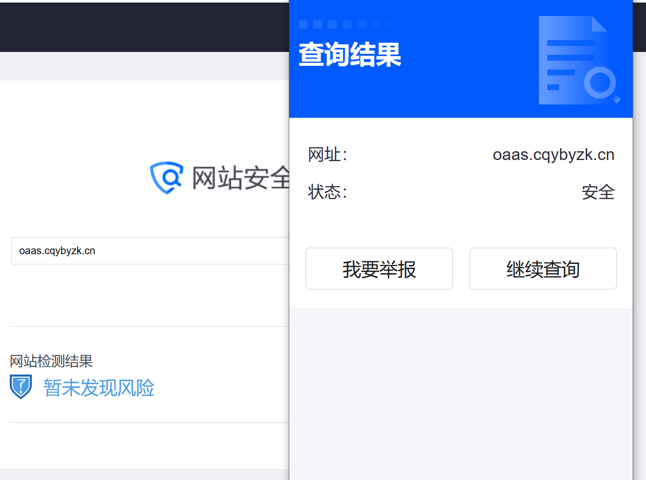 oaas.cqybyzk.cn已完成相关整改,在腾讯安全网址中心和安全实验室检测均安全,但微信内打开还是提示请到浏览器打开。域名已备案