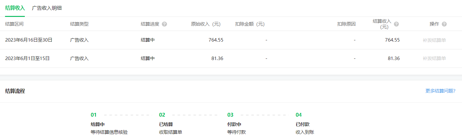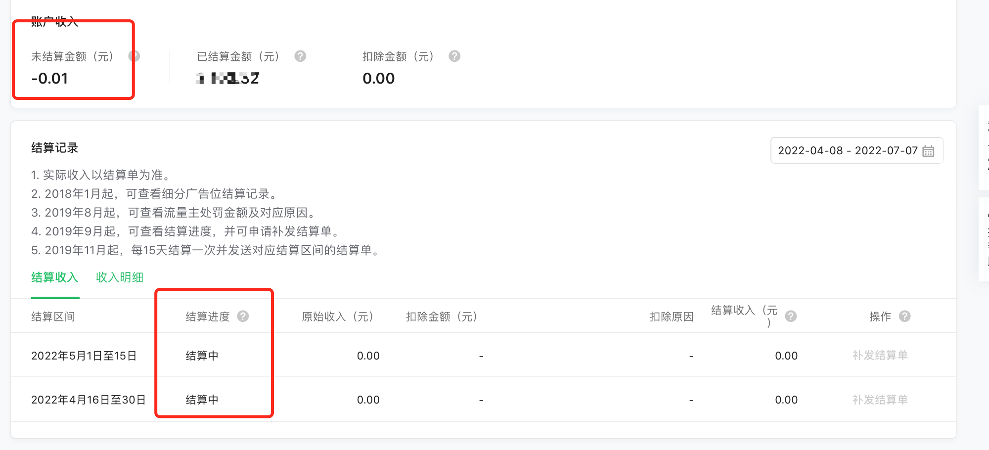 当结算区间的结算收入为0元时,对应结算进度会展示“结算中”。