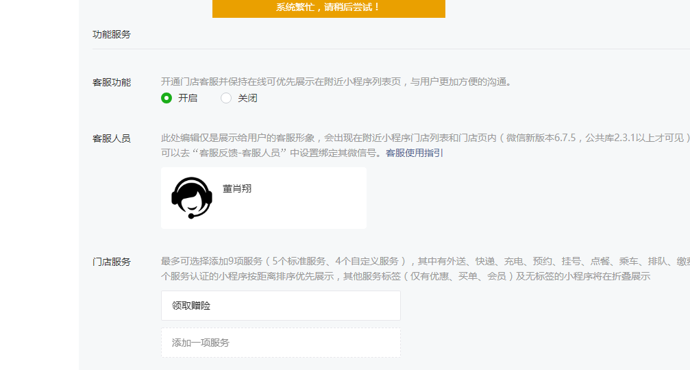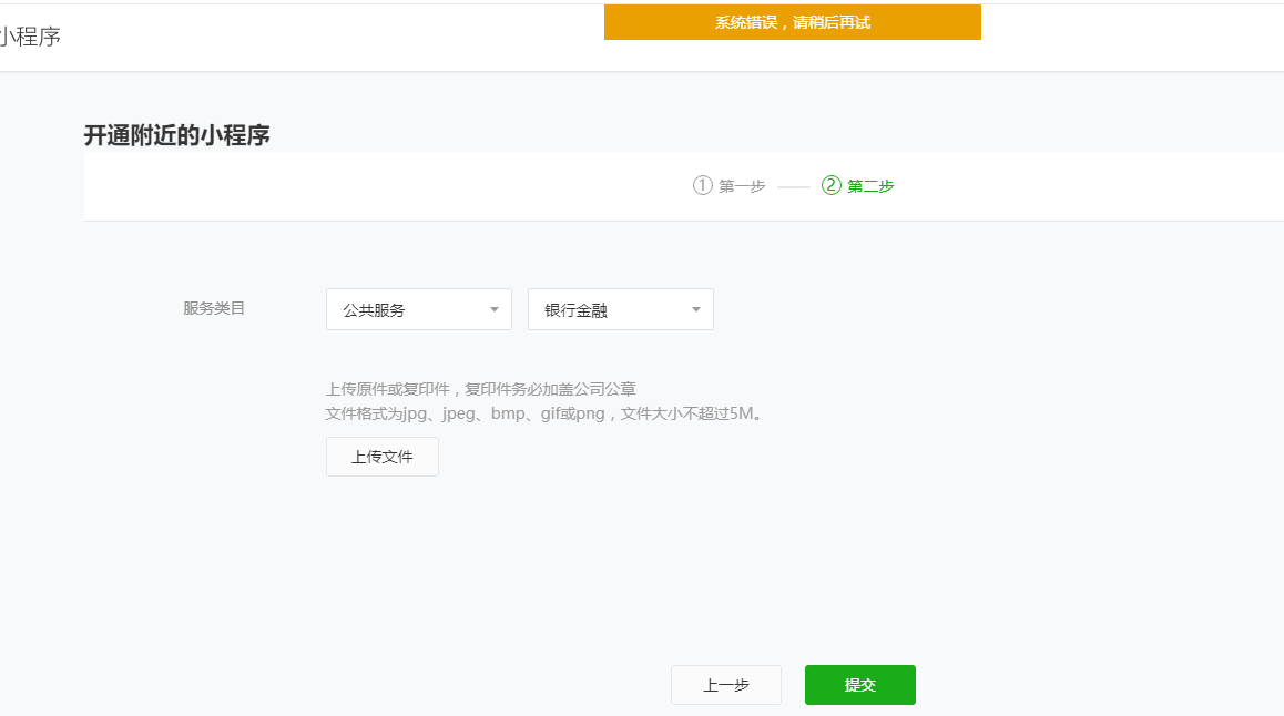 2019.7.23开通附近小程序添加类目 点击提交 系统一直提示系统错误,请稍后尝试 换了多个浏览器都是这样,如下图所示: